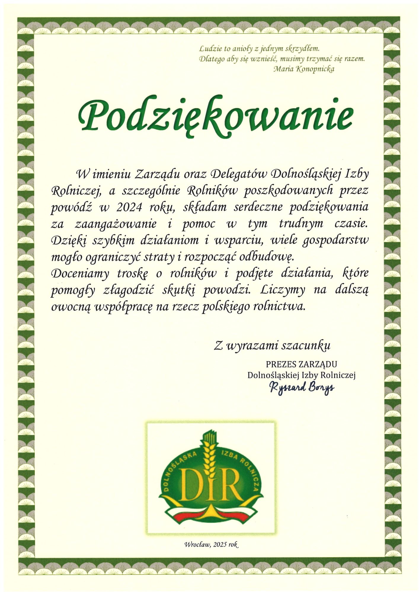 – Doceniamy troskę o rolników i podjęte działania, które pomogły złagodzić skutki powodzi. Liczymy na dalszą owocną współpracę na rzecz polskiego rolnictwa – podkreślił w treści podziękowania Ryszard Borys, prezes Dolnośląskiej Izby Rolniczej.